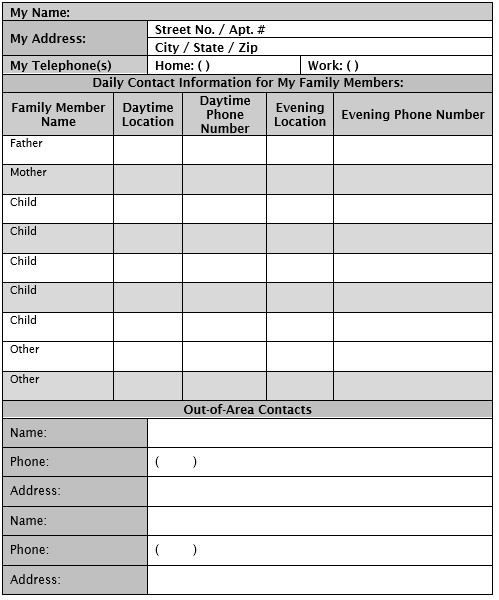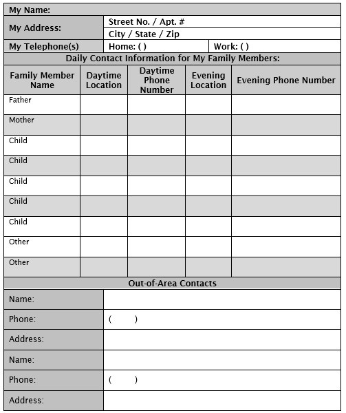 Chart 3 (following section) is a series of charts for accumulating critical post-emergency and disaster information. Completing the charts provides you the opportunity to record what everyone in the family – and perhaps, emergency personnel – would need concerning the daily whereabouts of each family member and how they can be contacted.