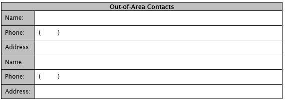 It might be appropriate to keep the less confidential information on the family bulletin board (in our house it's the refrigerator door!), a copy in each E/PAK, and a copy in your wallet. It would be wise to send a copy to a trusted friend or relative, your attorney, CPA, or parents. Remember to update this information with all members of the family or group as contact numbers and locations change.