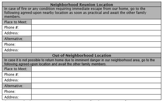 Additionally, determine two alternate locations for family members to reunite if it is unsafe to return home or to the neighborhood. One location should be just outside your home and the other away from the neighborhood. Use Chart 3 to put this information in writing for all family members.