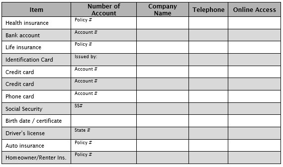 Also, consider keeping a summary of pertinent family operating information available in your E/PAK and wallet. What identification numbers etc., would be helpful should you have to leave home without notice? Use Chart 4 to record the information significant to your family.